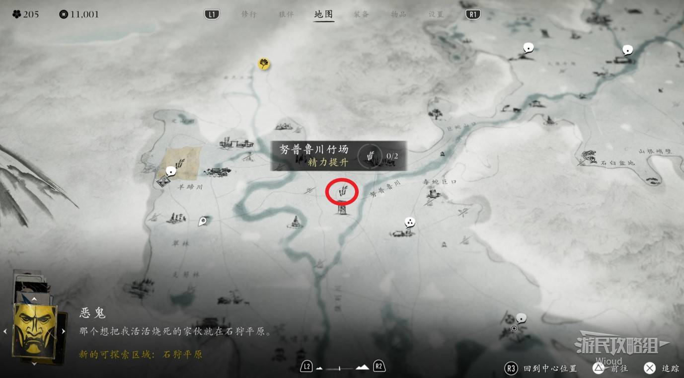 接下来是位于【羊蹄草原】区域左侧的羊蹄川竹场,具体位置如下图所示。到达后,你会发现竹场坐落在一个小山头上,环境清幽,适合玩家探索。