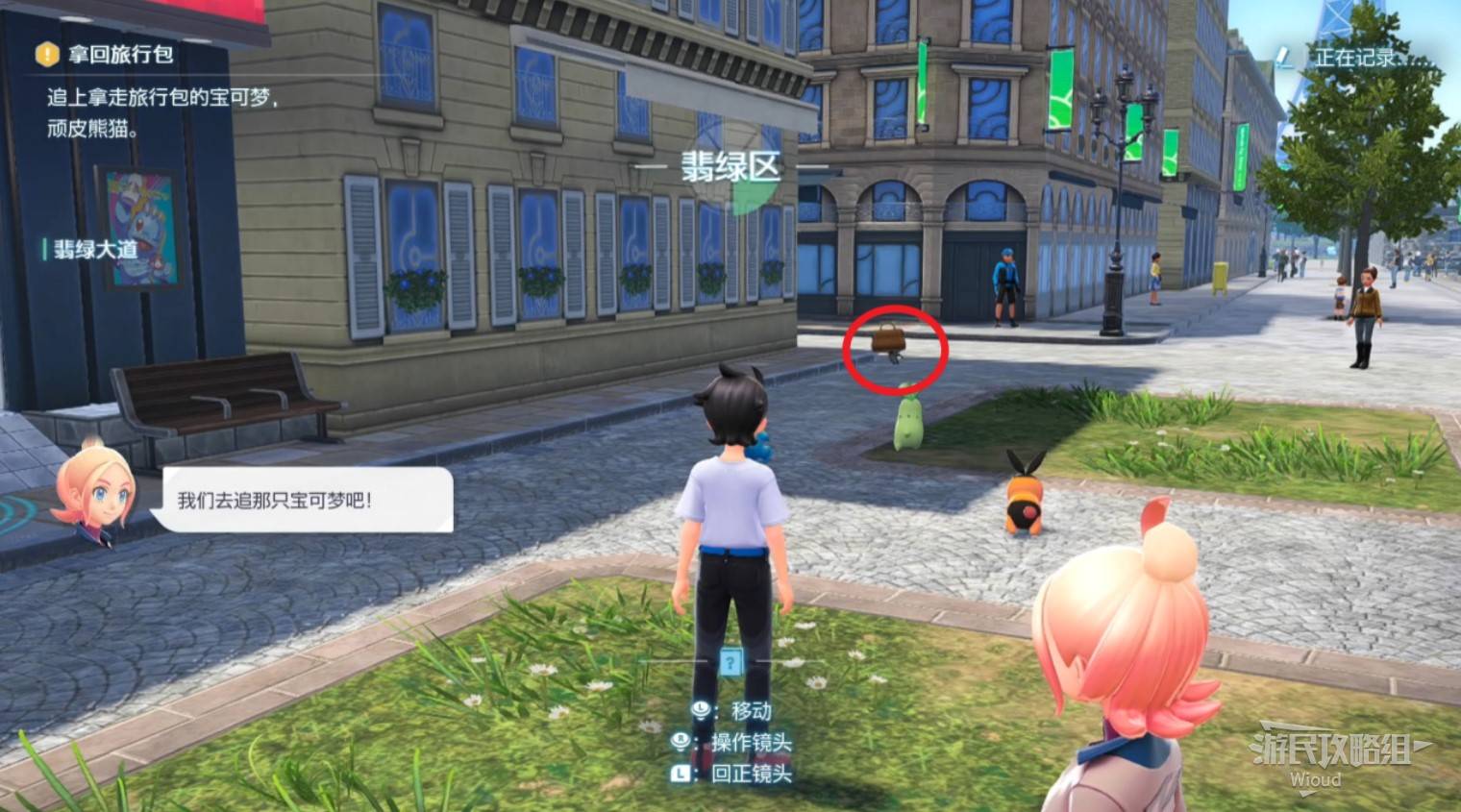 在站外,玩家将遇到未来的队友【盖伊/塔霓】。此时,正好有一只宝可梦偷走了我们的行李包,跟随它的背影追上去吧!