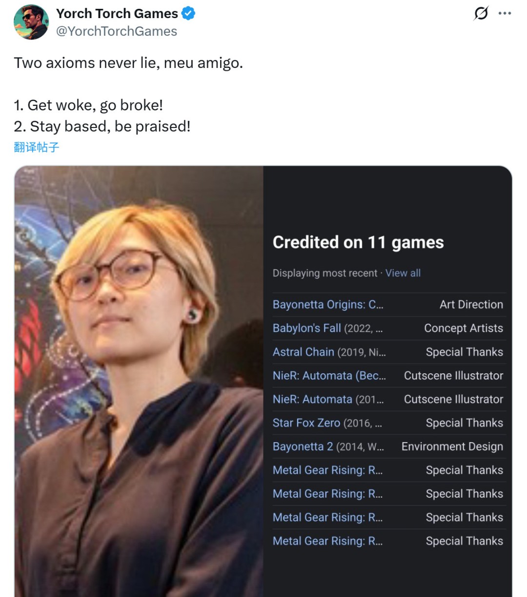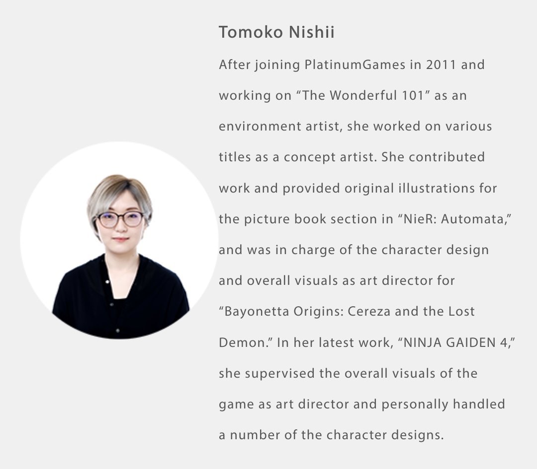 其实,西井智子并非初出茅庐的设计师,她参与了多款日本动作游戏的设计,累计达到11款之多,堪称行业老将。她曾参与的知名游戏系列包括《猎天使魔女》、《尼尔:机械纪元》、《合金装备崛起》、《巴比伦的陨落》和《异界锁链》等等。