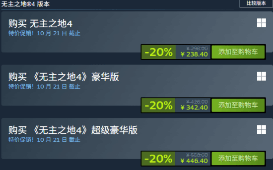 9月12日正式发售的《无主之地4》迎来了它的首次促销,真可以说是给广大玩家送来了一个大大的惊喜!国区目前推出了8折优惠活动,但要抓紧时间,因为这一活动仅持续一周,截止日期为10月21日。所有三个版本都在打折中,具体价格如下:标准版238.4元、豪华版342.4元、超级豪华版446.4元。而需要注意的是,DLC的价格依旧保持原价,并没有参与此次促销。